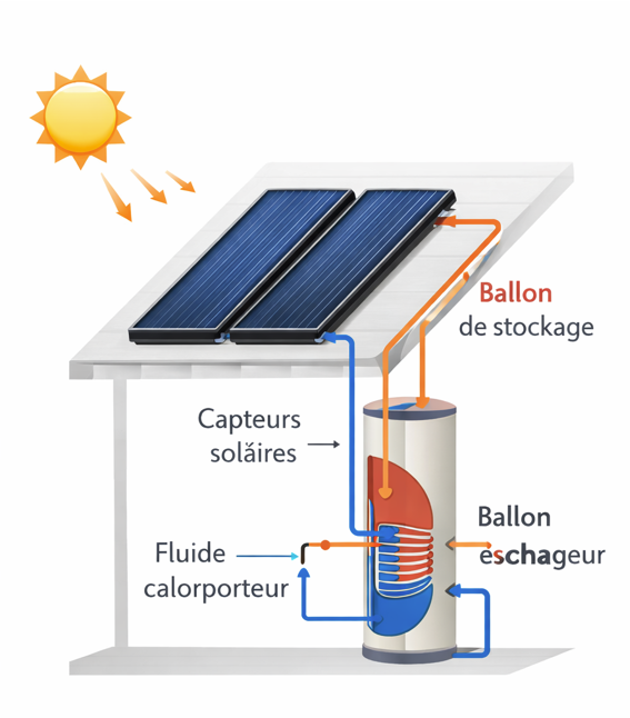 Schéma de principe du chauffe-eau solaire (capteurs / ballon / échangeur)